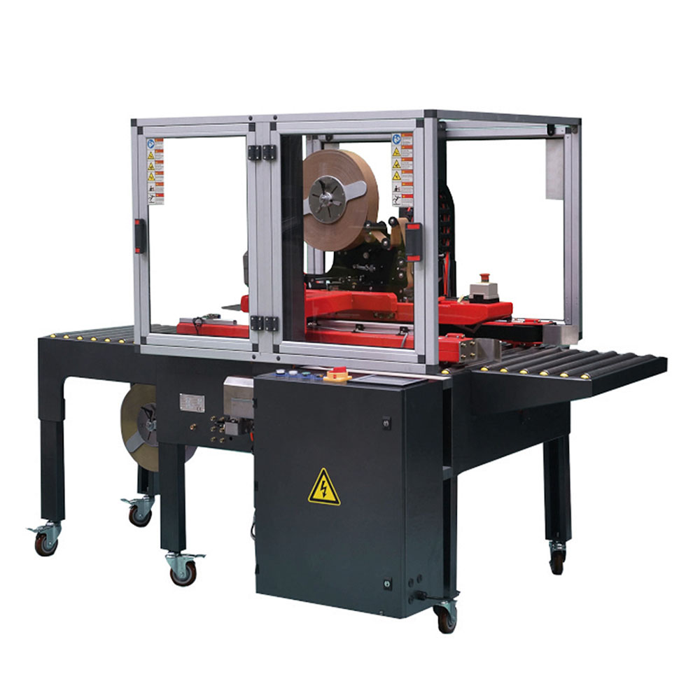 Transport kartonów jest realizowany przez dolne boczne pasy napędowe oraz przenośniki rolkowe wejścia i wyjścia, co pozwala na płynne przeprowadzenie kartonu przez cały cykl pracy. Urządzenie posiada zabezpieczenia bezpieczeństwa, takie jak blokada drzwi oraz przycisk awaryjnego zatrzymania, które zapewniają bezpieczną obsługę w środowisku przemysłowym. Panel sterowania umożliwia intuicyjną obsługę i nadzorowanie procesu pakowania bez konieczności zaawansowanego szkolenia operatora.