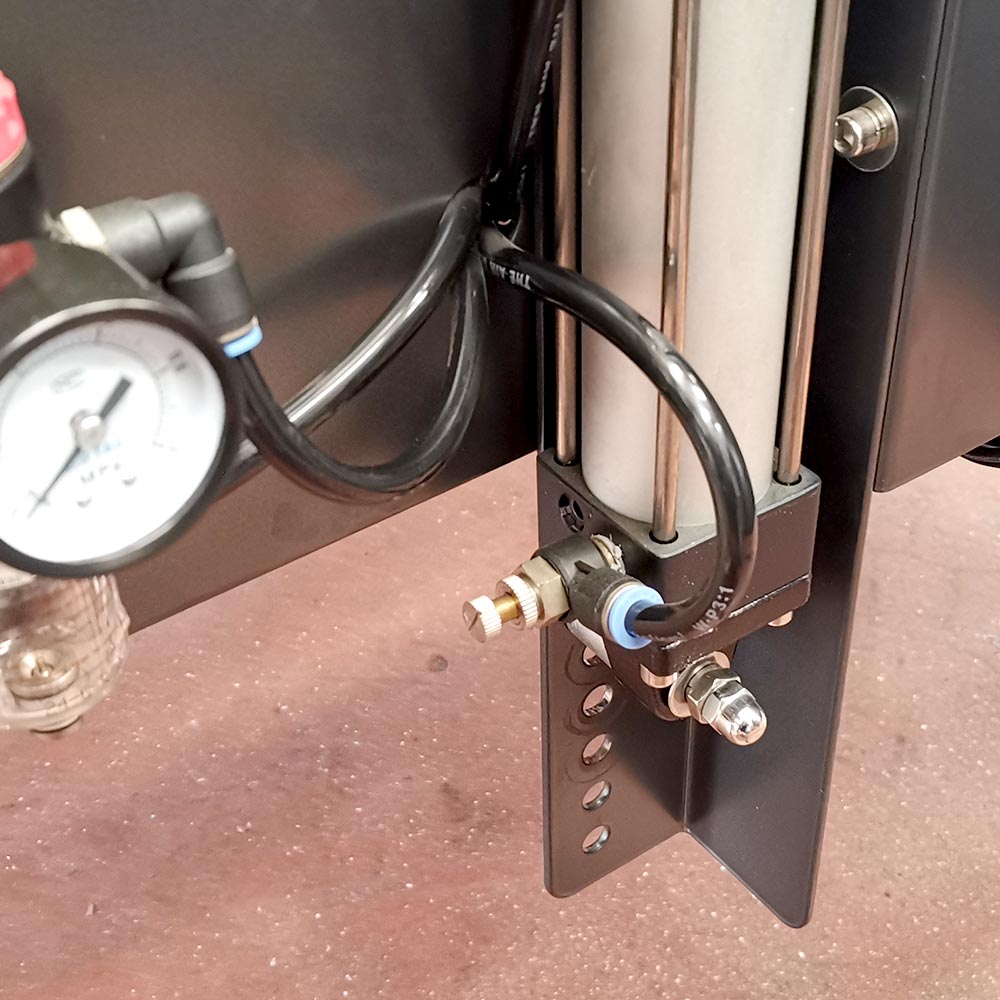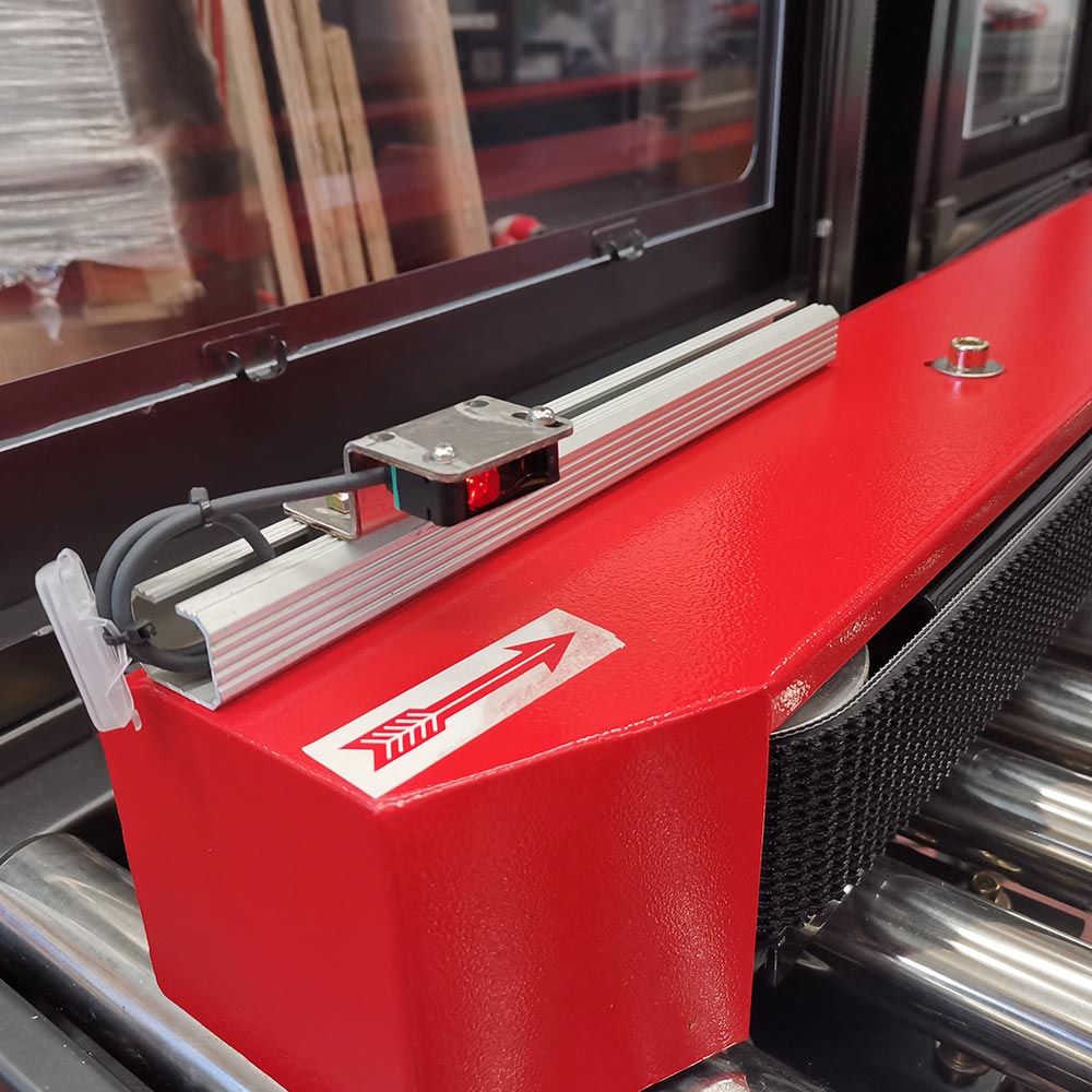 Maszyna posiada przenośniki rolkowe wejścia i wyjścia dla płynnego przepływu pracy oraz intuicyjny panel sterowania.