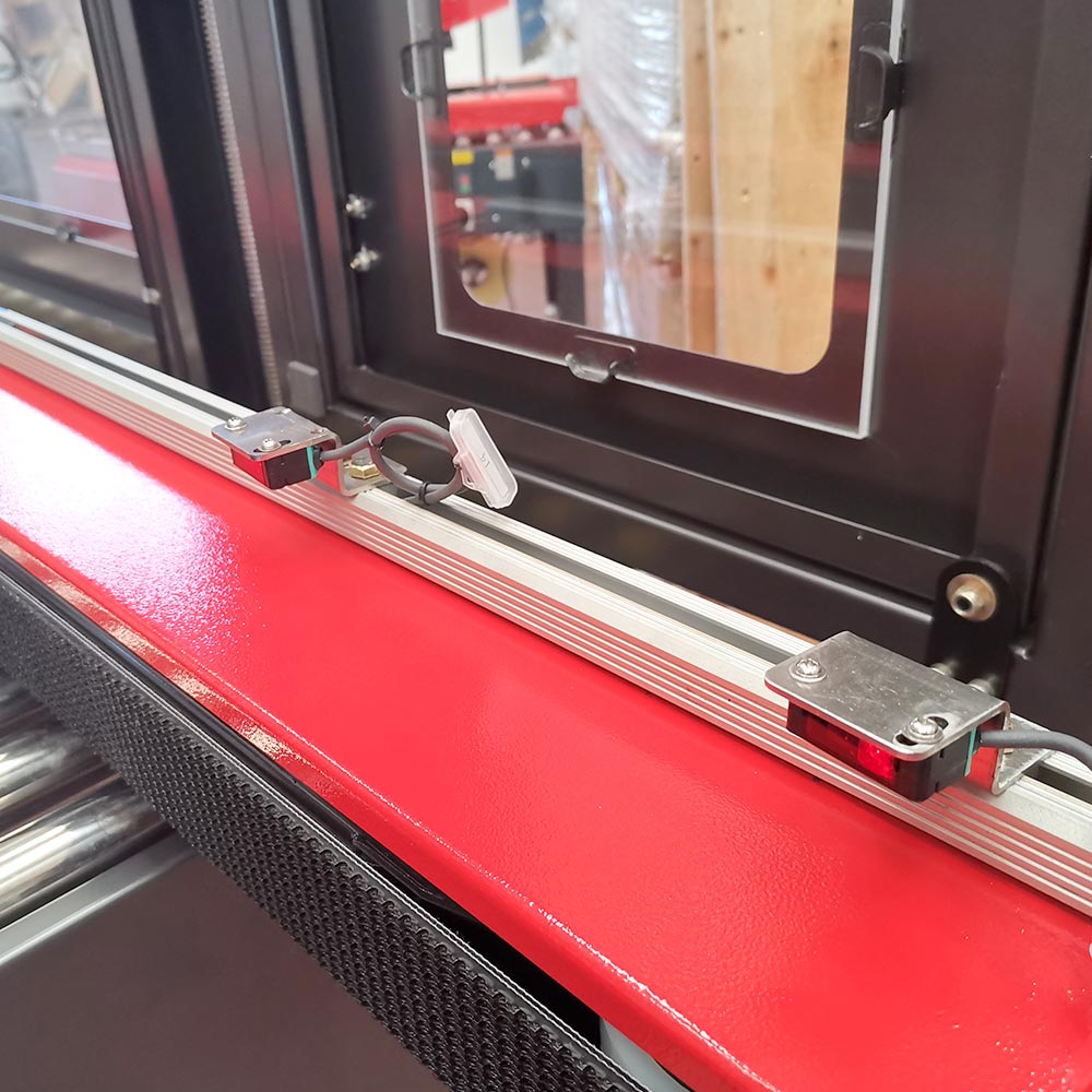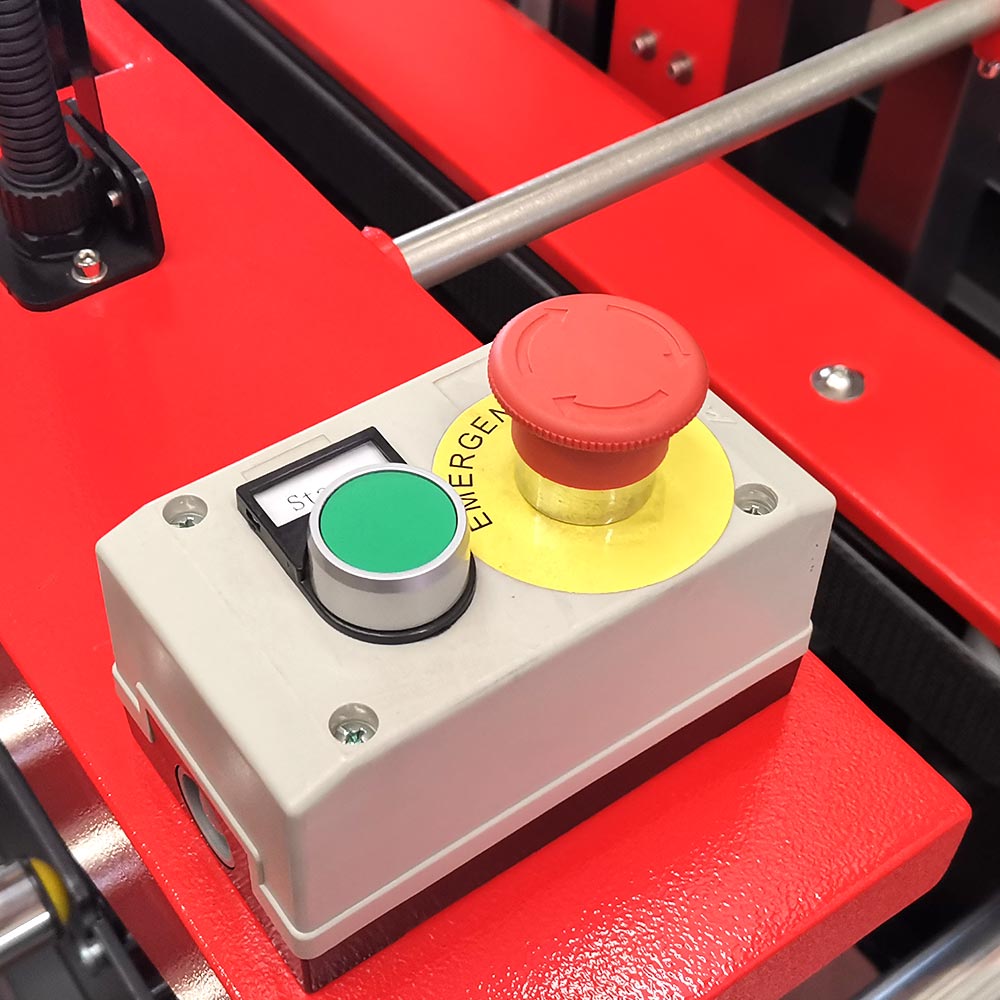 Zaklejarka Random Tape 50 SB została zaprojektowana z uwzględnieniem obowiązujących zasad bezpieczeństwa maszyn. Urządzenie jest wyposażone w blokadę otwarcia drzwi, która zapobiega uruchomieniu napędu przy otwartych drzwiach, oraz przycisk awaryjnego zatrzymania, umożliwiający natychmiastowe odcięcie napędu w sytuacjach krytycznych. Intuicyjny panel sterowania umożliwia łatwe uruchamianie, zatrzymywanie oraz kontrolę podstawowych parametrów pracy maszyny.