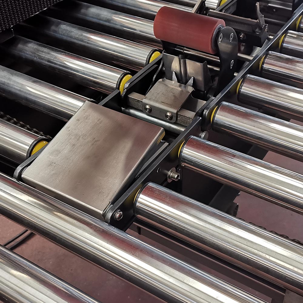 Maszyna posiada przenośniki rolkowe wejścia i wyjścia, które ułatwiają płynne podawanie i odbiór kartonów. Transport kartonu realizowany jest przez boczne pasy napędowe, które zapewniają równomierny przesuw oraz właściwe ustawienie klap przed aplikacją taśmy. Konstrukcja transportu została zoptymalizowana w celu zapewnienia stabilności i powtarzalności procesu zaklejania, nawet przy różnorodnych formatach kartonów.