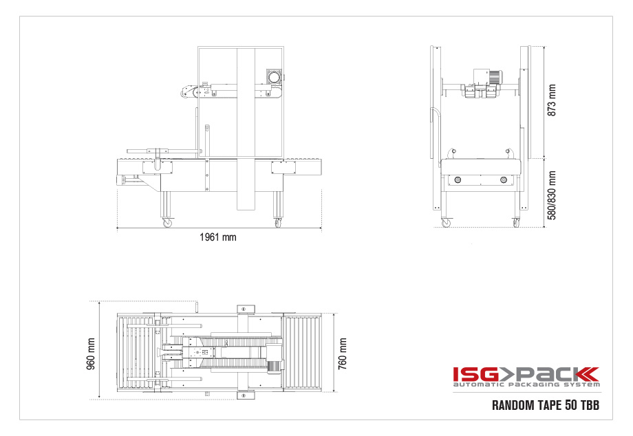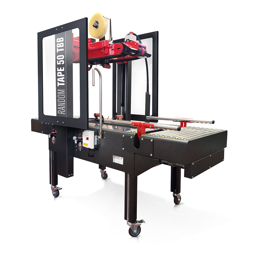Półautomatyczna zaklejarka Random Tape 50 TBB to maszyna pakująca do zaklejania górnej i dolnej części kartonów klapowych taśmą samoprzylepną.