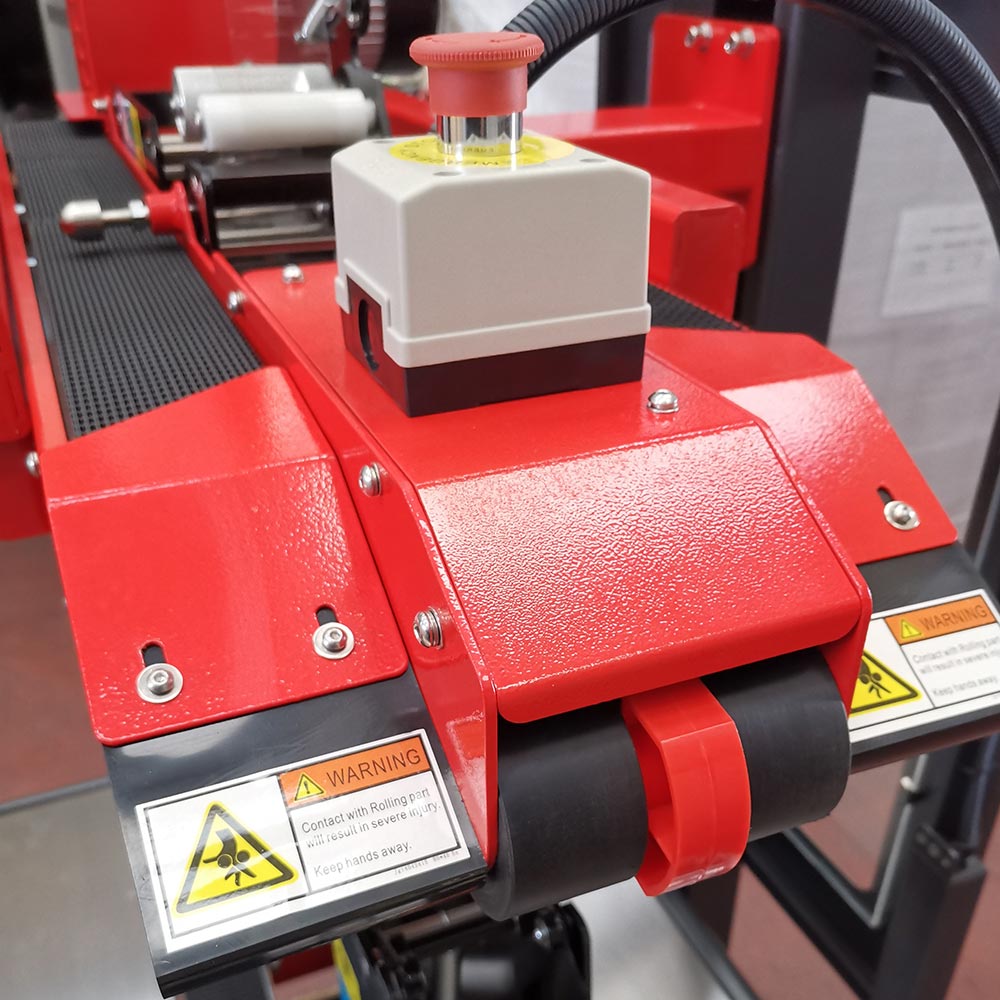 Maszyna została zaprojektowana z uwzględnieniem zasad bezpieczeństwa maszyn oraz ergonomii pracy operatora. Urządzenie wyposażone jest w blokadę otwarcia drzwi, która zapobiega uruchomieniu napędu przy otwartym panelu, oraz przycisk awaryjnego zatrzymania umożliwiający natychmiastowe odcięcie napędu w sytuacjach krytycznych. Stabilna konstrukcja i napęd pasów zapewniają bezpieczne prowadzenie kartonów bez ryzyka kontaktu operatora z elementami ruchomymi.