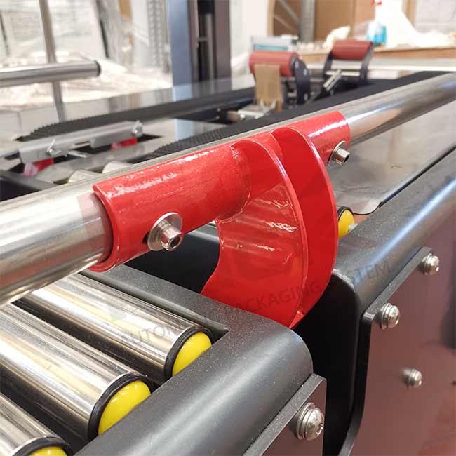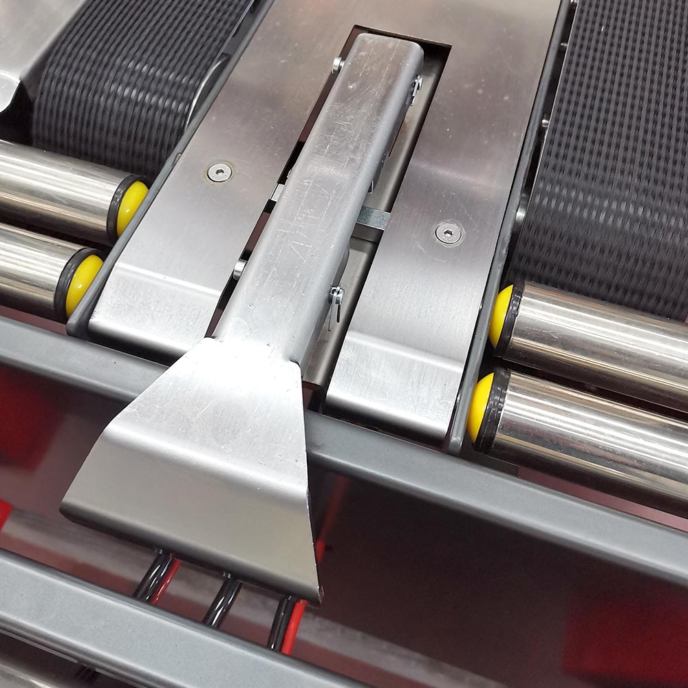 Transport opakowań realizowany jest przez cztery napędzane pasy – dwa górne i dwa dolne – zapewniające stabilny przesuw.
