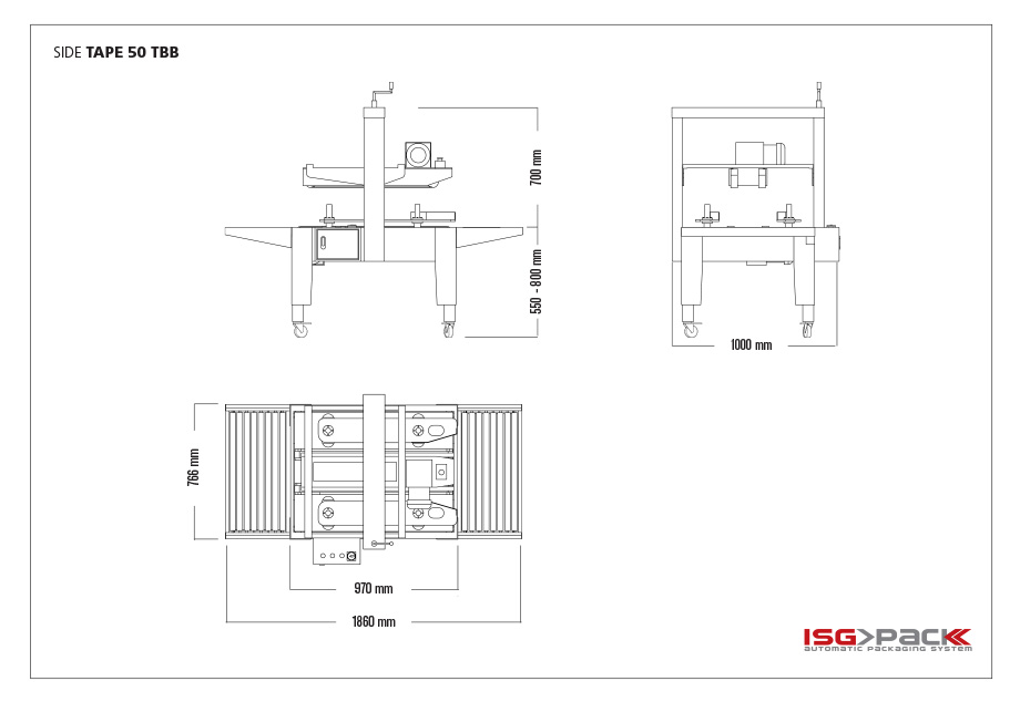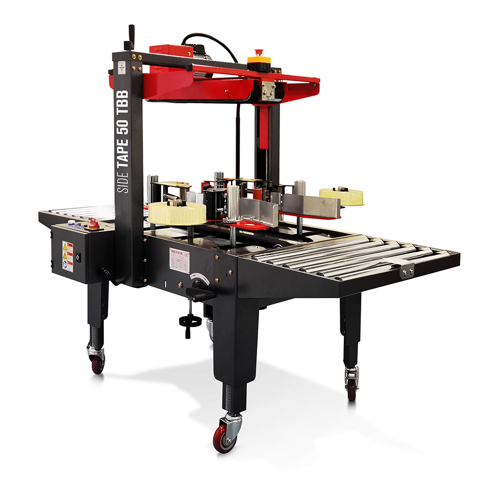Półautomatyczna zaklejarka Side Tape 50 TBB to urządzenie pakujące przeznaczone do zaklejania kartonów klapowych przy użyciu taśmy samoprzylepnej w układzie bocznym; głowice zaklejające umieszczone są po bokach maszyny. Urządzenie umożliwia zabezpieczanie kartonów w pozycji leżącej oraz zamykanie opakowań z nakładanym wiekiem lub o konstrukcji wymagającej bocznego aplikowania taśmy. Konstrukcja wyposażona jest w manualny system dopasowania do rozmiaru opakowania, który pozwala operatorowi na ręczne ustawienie parametrów formatu kartonu przed rozpoczęciem pracy.