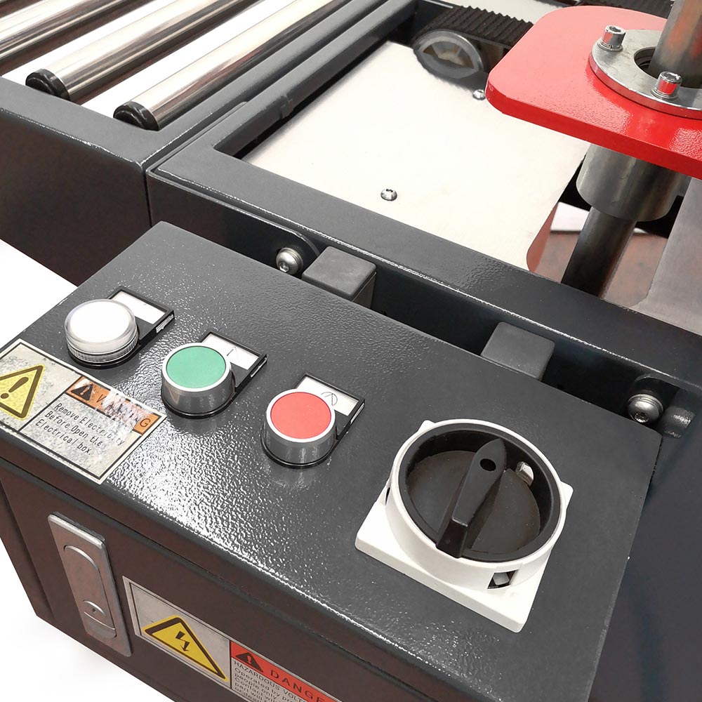 Zaklejarka Side Tape 50 TBB posiada napęd złożony z czterech pasów trakcyjnych – dwóch górnych i dwóch dolnych – które zapewniają stabilne prowadzenie kartonu przez strefę zaklejania. Operator wprowadza karton na rolkowy przenośnik wejściowy, a pasy napędowe chwytają opakowanie i prowadzą je przez głowice boczne, które aplikują taśmę na łączenia kartonu. Napęd pasów górnych i dolnych wpływa na jednolity przesuw opakowania i właściwe wyrównanie klap przed aplikacją taśmy.