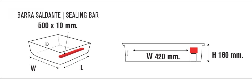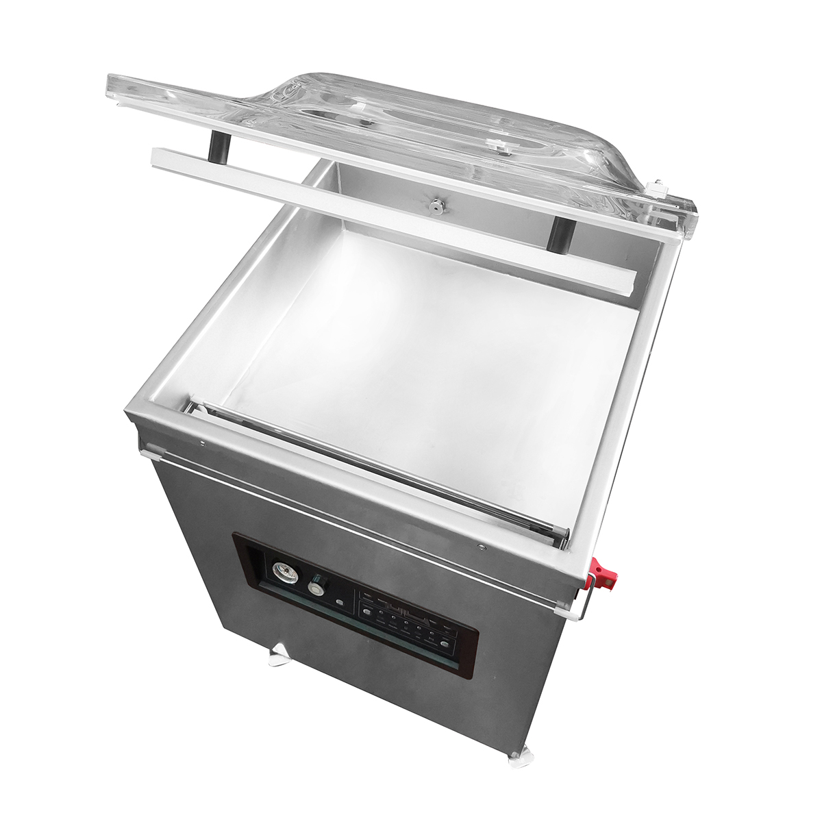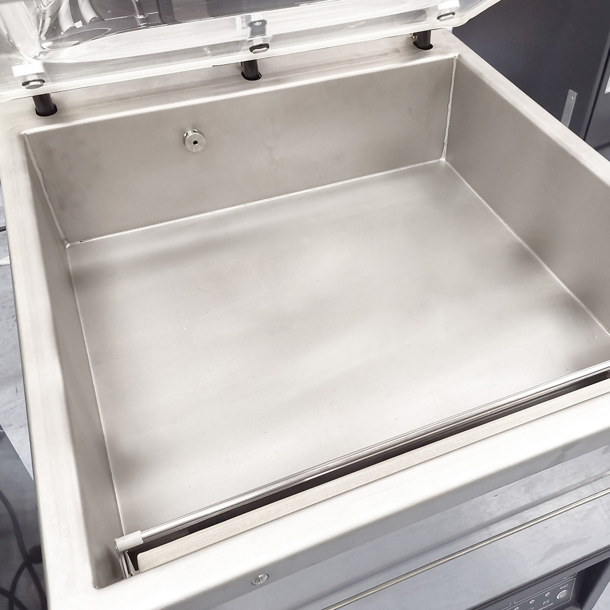 Pakowarka posiada komorę pakującą o wymiarach 500 × 450 × 200 mm, co pozwala na umieszczanie większych produktów lub zestawów produktów w jednym cyklu pakowania. Wewnątrz komory znajduje się jedna listwa zgrzewająca o szerokości 8 mm, która odpowiada za trwałe i szczelne zamknięcie worków próżniowych po usunięciu powietrza. System wózkowy umożliwia swobodne umieszczanie i wyjmowanie produktów z komory, co usprawnia obsługę i zwiększa ergonomię pracy operatora.