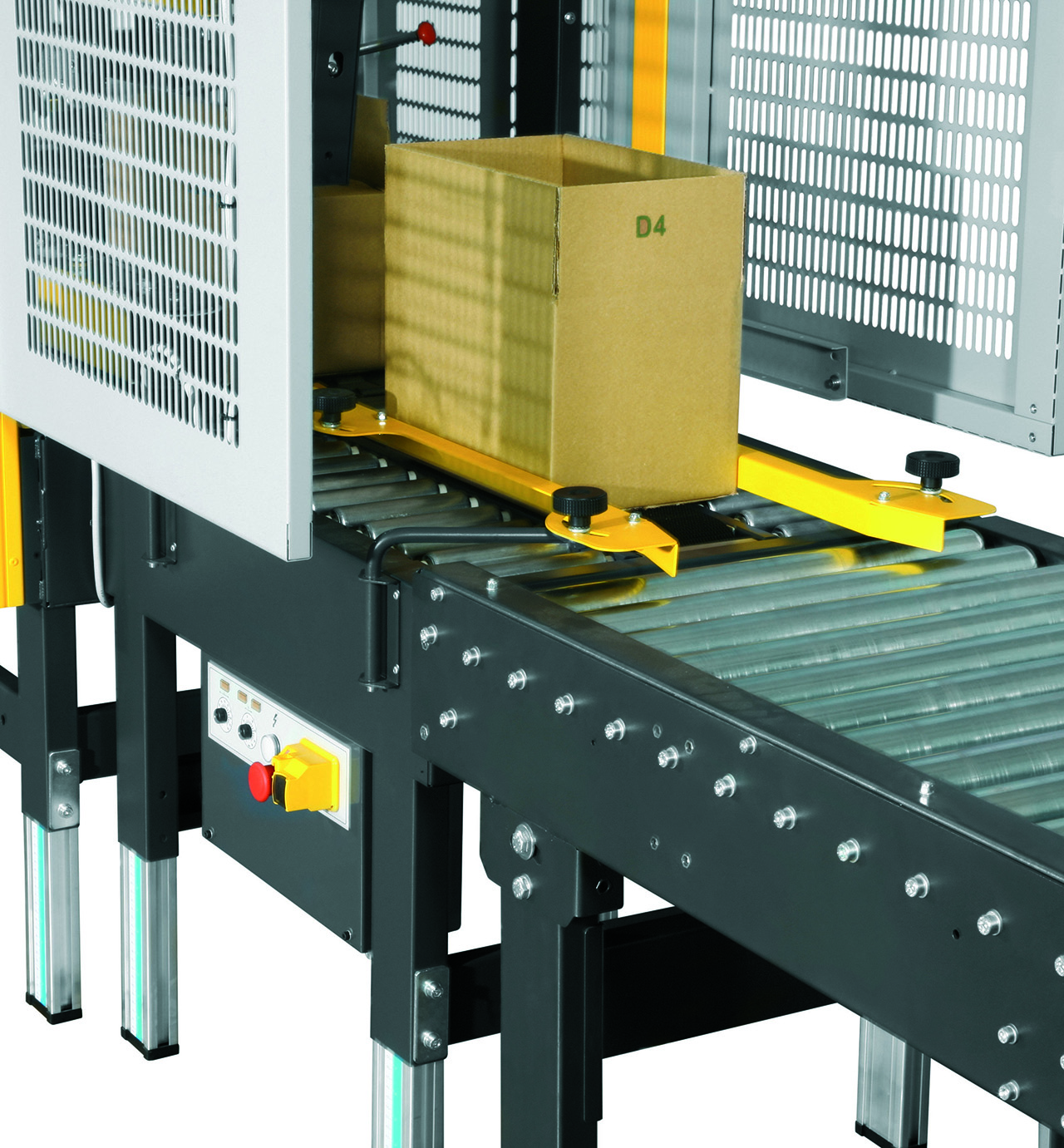 SM11 Range to zaklejarka typu „Fixed Format”, co oznacza, że wszystkie regulacje są wykonywane ręcznie przez operatora. Za pomocą pokręteł i uchwytów ustawiana jest szerokość, wysokość i długość kartonu, co pozwala precyzyjnie dopasować urządzenie do wymiarów opakowań. Regulacja wysokości roboczej odbywa się w zakresie 500–750 mm, umożliwiając integrację z różnymi systemami przenośników rolkowych i taśmowych. Takie rozwiązanie sprawia, że maszyna jest uniwersalna i może obsługiwać wiele formatów kartonów w liniach produkcyjnych lub magazynowych.