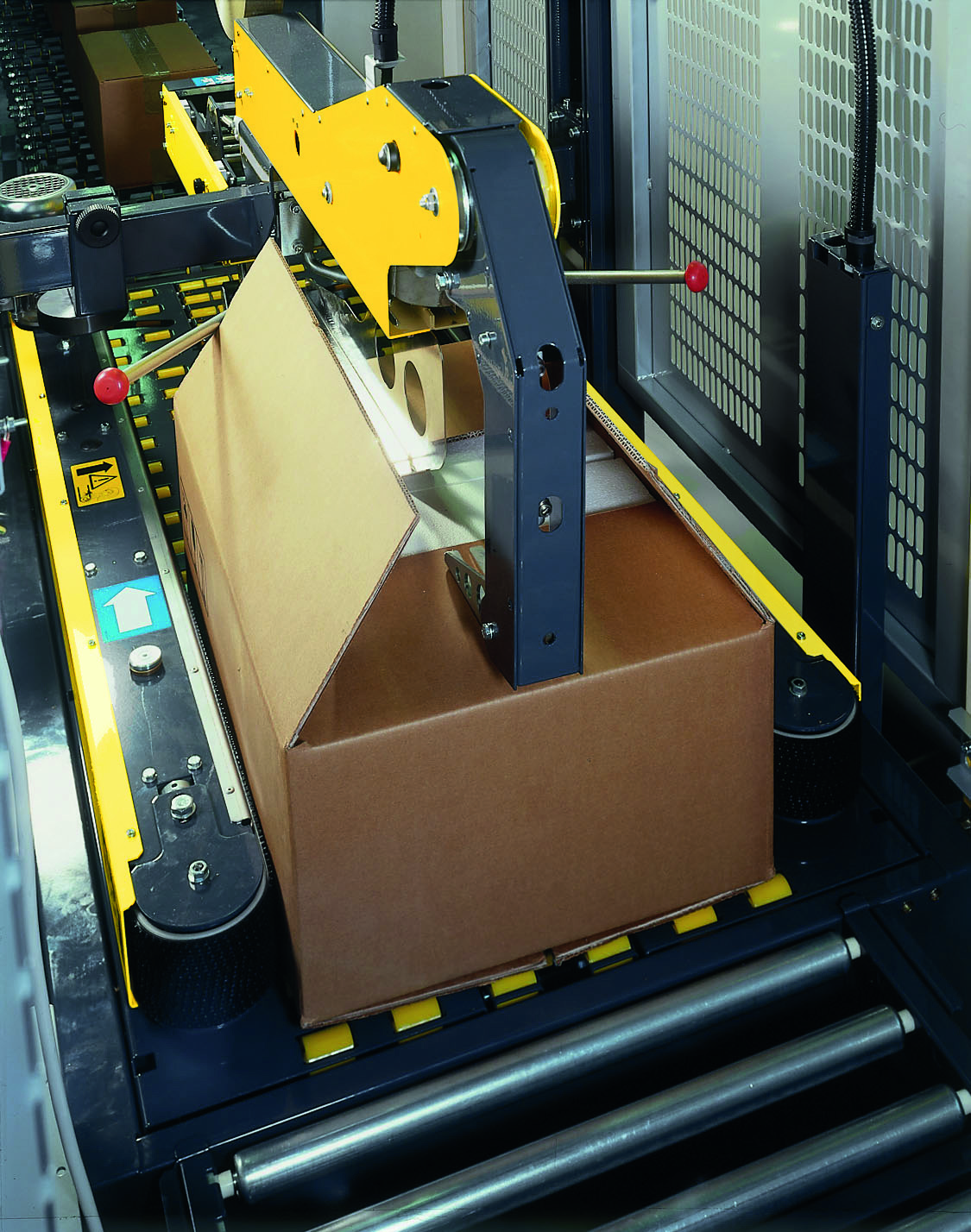 SM11 Range wyposażona jest w podwójny system nakładania taśmy klejącej – jeden pasek na górne klapy kartonu, drugi na dolne. Kartony prowadzone są przez pasy napędowe, które gwarantują ich stabilne ustawienie podczas zaklejania. Górne klapy są składane automatycznie, co minimalizuje konieczność interwencji operatora i zwiększa powtarzalność procesu. Napęd pasów został zoptymalizowany, aby utrzymać równomierne napięcie taśmy i zapobiegać przesuwaniu się lub odklejaniu materiału. Cały mechanizm jest niezawodny i wytrzymały, a elementy napędu łatwe w konserwacji.