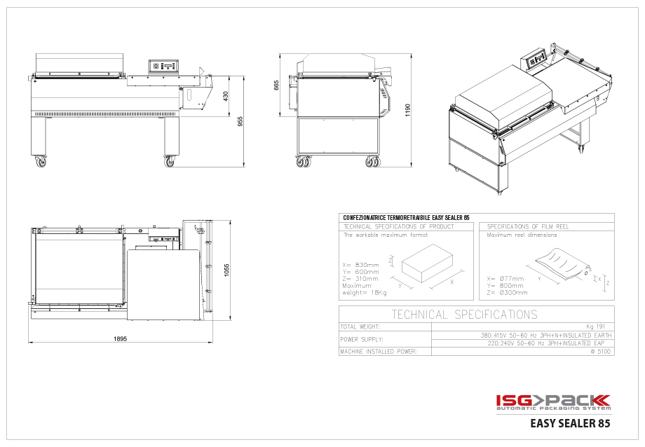 Easy Sealer 85 obsługuje folie termokurczliwe wykonane z PVC i poliolefin o maksymalnej grubości do 30 µm, co obejmuje większość standardowych materiałów stosowanych w pakowaniu przemysłowym i handlowym. Maksymalna wysokość pakunku, którą urządzenie może obsłużyć, wynosi 310 mm, a wymiar belki zgrzewającej to 870 × 620 mm, co pozwala na pakowanie produktów o znaczących rozmiarach. Rolki folii mogą mieć maksymalną szerokość 800 mm i średnicę zewnętrzną do 300 mm, co zwiększa elastyczność zastosowań i umożliwia pracę z różnorodnymi formatami opakowań. Urządzenie osiąga produkcję do około 300 pakunków na godzinę, co czyni je odpowiednim rozwiązaniem w środowiskach o średnim i większym natężeniu pakowania.