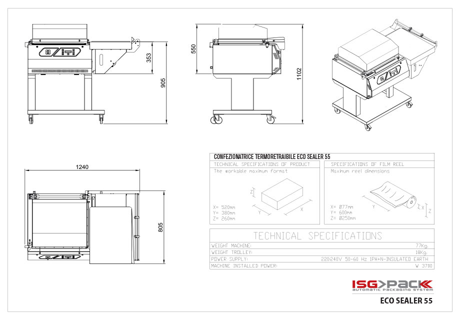 Maszyna została zaprojektowana z myślą o średnich i małych przedsiębiorstwach produkcyjnych, handlowych oraz usługowych, które potrzebują efektywnego i estetycznego pakowania produktów w folię termokurczliwą. Kompaktowa konstrukcja pozwala na łatwe zintegrowanie urządzenia ze stanowiskiem pracy, a solidna stalowa rama zapewnia długotrwałą i niezawodną eksploatację. Eco Sealer 55 pracuje z folią PVC i poliolefin (POF) o maksymalnej grubości do 30 µm, co obejmuje większość standardowych filmów stosowanych w pakowaniu detalicznym i produktach średniej wielkości. Maksymalna wysokość pakunku wynosi 260 mm, a pole zgrzewania 560 × 430 mm. Maszyna obsługuje rolki folii o szerokości do 600 mm i średnicy do 250 mm, co zwiększa elastyczność zastosowań.